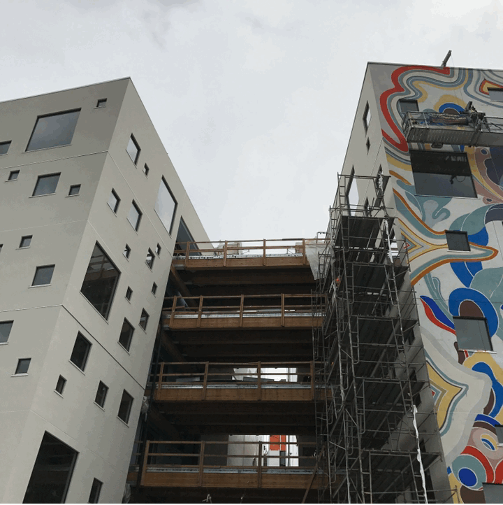 2D wall-art that seamlessly converged with the 3D wall and wrapped around the sidewalls, dissipating as it approached the glass entry