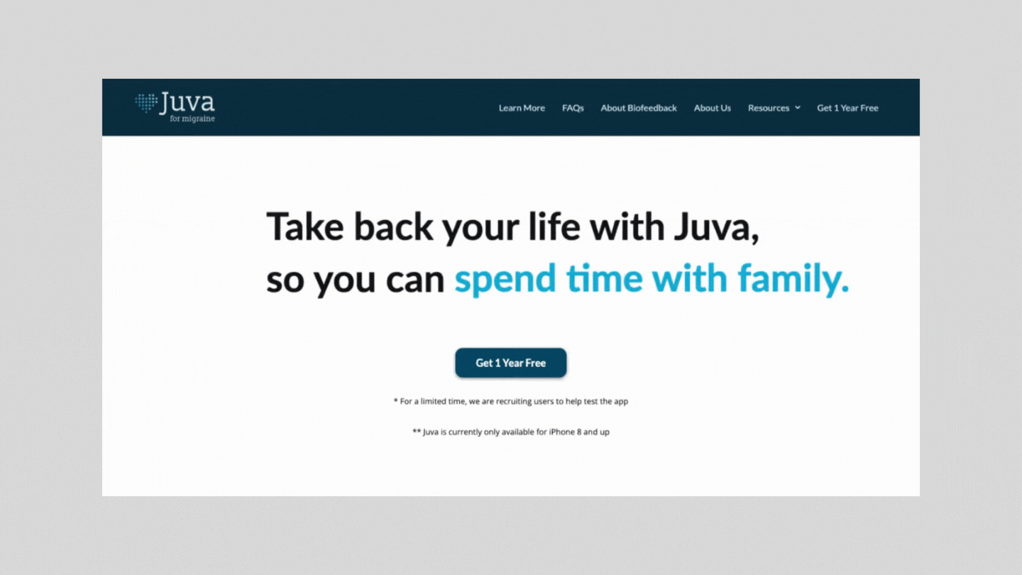 The revolving homepage headline cycles through the activities that people who suffer from migraine miss due to chronic pain. Naming these truths shows the audience that Juva understands their struggle and is here to help. These audience insights informed the new tagline, "Juva for Migraine, So You Can."
